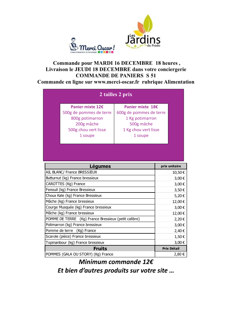 Commande du jeudi au mardi 18h. Livraison vers 11h le jeudi sur votre conciergerie.